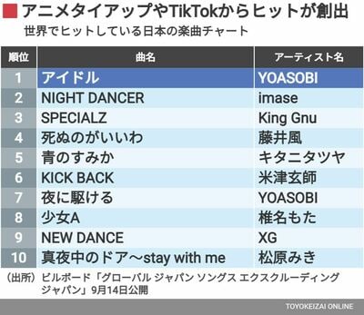 上位にはアイドル(推しの子)、KICK BACK(チェンソーマン)など、アニメタイアップで広く支持を得た楽曲に加え、TikTokで人気を獲得したアーティストも並ぶ。imaseはその代表格の若手。NIGHT DANCERは昨年8月のリリースで、韓国など海外でも聴かれている。