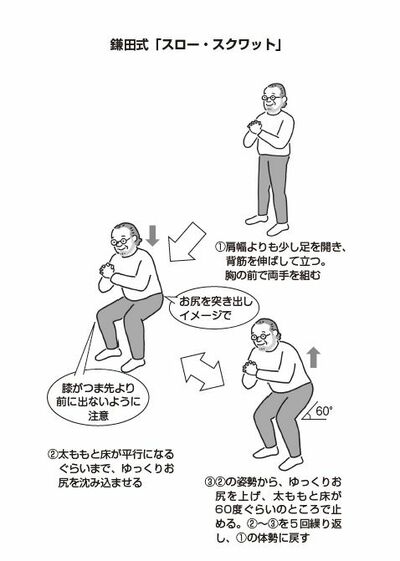 「貯筋」のためにはウォーキングだけでは不十分で、筋トレも必要です。でも、筋トレも多くの高齢者にとってはハードルが高いですよね。僕が勧めるのは「鎌田式スロー・スクワット」と「鎌田式かかと落とし」。スロー・スクワットでお尻や太ももなどの大きな筋肉を、かかと落としで「第二の心臓」といわれるふくらはぎを刺激し、全身の血流を促します。筋トレに慣れないうちは、テーブルなどにつかまりながらやってもかまいません。