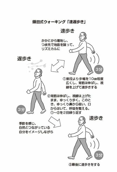 ただ、歩幅を広くといっても70歳を過ぎると頑張りすぎてひざを痛めたり、呼吸が乱れてしまいます。僕が考案した「鎌田式ウォーキング」は、速歩きと遅歩きを組み合わせた「速遅歩き」。