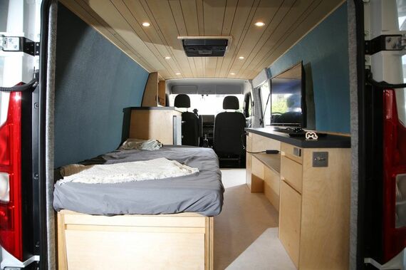 一方、室内では、約7平米の荷室スペースを架装し、大人2名が快適に過ごせる空間を演出する。天井には、軽量ながら見た目が美しいスプルース材を使用。各板は、ピッチを変えることで、全体的に単調にならない工夫も施されているほか、LED照明を6カ所に配置し、夜間でもくつろげる空間となるよう配慮されている。また、左右の壁には上質で落ち着きのある藍色の壁紙を貼り、まるで宇宙旅行をしているような雰囲気を演出。ブランド名のムーンは「月」という意味もあるため(つづりは違うが)、それを体現するような仕様にしているようだ。