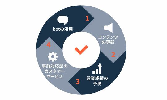 生成AIを、顧客とのつながりの創出にどう活用できるのか。何から始めればいいのかわからないという企業も多いのではないだろうか。まず着手するべき具体的な方法として「botの活用」「コンテンツの更新」「営業成績の予測」「事前対応型のカスタマーサービス」の4つが挙げられる。
