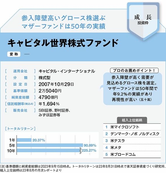 4位は「キャピタル世界株式ファンド」(キャピタル・インターナショナル)。米大手運用会社キャピタルが中長期的な成長の期待される世界のグロース株を軸に選定。同社は世界各地に拠点があり、複数のポートフォリオマネジャーが連携、1つのファンドを運用している。