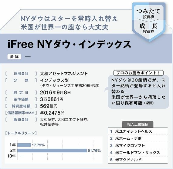 ちなみにNYダウは、時価総額の大きなスター銘柄が現れると、指数全体が保たれるよう銘柄が入れ替えられる。ゴールドマン・サックスやマクドナルドなど米国を代表する有名企業に投資できるのがポイントだ。