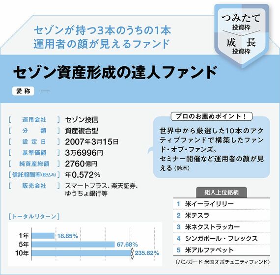 同じく4位は「セゾン資産形成の達人ファンド」(セゾン投信)。「長期積立」を理念にファンドを3本しか持たないセゾン投信が世界株に分散投資する1本だ。米バンガードや米アライアンスなどから選んだ10本のアクティブファンドで構築。顧客向けにセミナーも全国で定期開催しており、「運用者の顔が見える代表的なファンド」(JOYnt代表の鈴木雅光氏)。