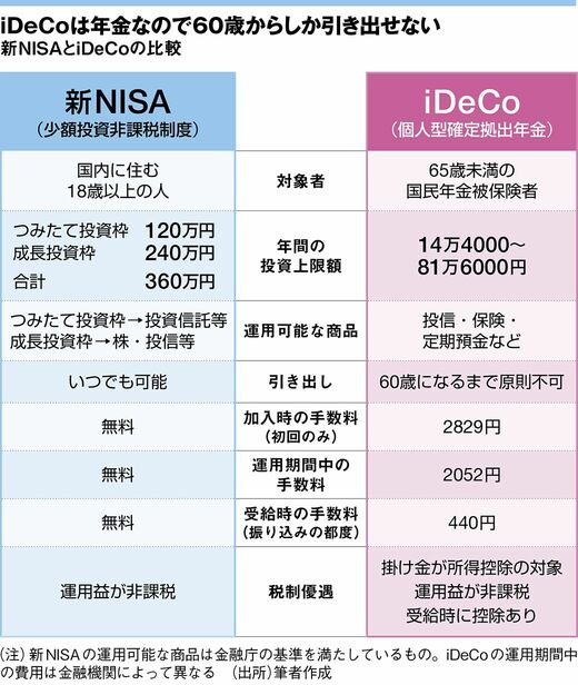 新NISAで運用する資金はいつでも引き出すことができるため、結婚や出産、教育、住宅購入などの積み立てに向いている。iDeCoは60歳まで引き出せないから、老後資金の準備が主な目的となってくるだろう。