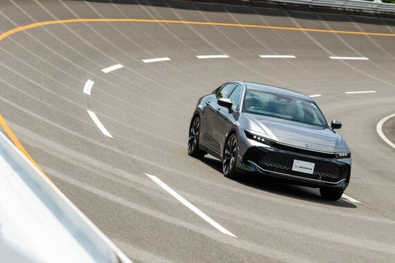まずはトヨタが新開発した「デュアルブーストハイブリッド」搭載のクラウン(クロスオーバーRS)で高速周回路を走行。装着されているタイヤは一般販売される補修用タイヤではなく新車装着用(OE用)eプライマシーだ。