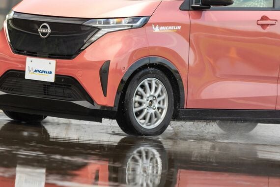 続いて、電気自動車である日産「サクラ」でウェットのハンドリング路での試乗だ。ここではミシュランのスタンダードタイヤ「エナジーセイバー4(転がり抵抗係数:A、ウェットグリップ性能:C)」とeプライマシーの相対比較となる。サイズは上級グレードにOP設定される165/55R15である。