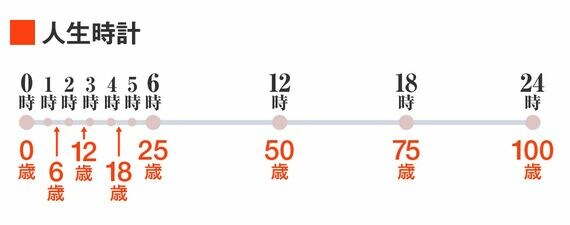 今の子どもたちは100歳まで生きる可能性が高いと言われていますので、100歳が24時ということにしたいと思います。ですから、50歳の人は一日に置き換えるとお昼の12時ということになります。25歳が朝の6時で、やっと夜明けの時間帯です。