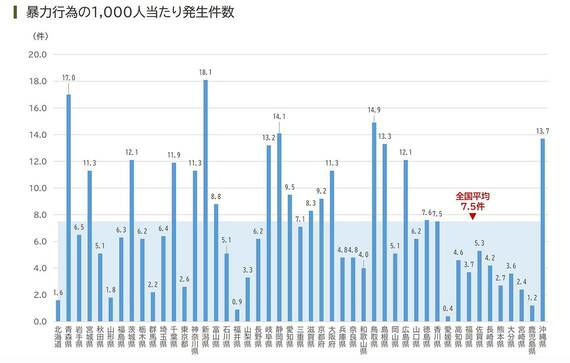 新潟県や青森県のように比較的多い県と、愛媛県、福井県、鹿児島県のように比較的少ない県との間では、相当な開きがある。最も多い新潟県は、最も少ない愛媛県の約45倍だ。都市部と地方との差であるとも思えないし、新潟や青森の子どもたちがキレやすいとか、人間関係づくりが苦手だなど、特異な要因があるとも思えないので「暴力行為」としてなるべく丁寧に把握、カウントしようとしている自治体と、そうでない自治体との差である可能性があるのではないか。