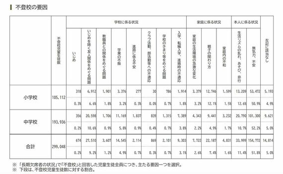 下記は不登校の要因について、各学校が回答したものだが、本来複合的な背景・要因であることも多い不登校について、1件につき1つの要因しか回答できない仕様となっている。しかも、学校側の認識として「無気力・不安」が小・中学校とも最多で約半数を占めているが、「無気力・不安」は不登校の要因なのだろうか? むしろ不登校が続いた結果ではないのか? など調査項目の妥当性も疑問視されている。
