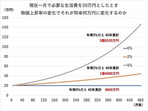 日銀が目標にしている物価上昇率である2%が達成される想定だと、およそ1億4700万円、当初想定の1.5倍を超える。仮に5%だと、なんと3億円以上となる。