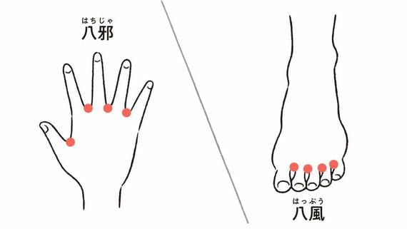 末端の冷えには、足の指の間にある「八風(はっぷう)」と、手の指の間にある「八邪(はちじゃ)」を選択しましょう。手足の指の水かき部分にそれぞれ左右8穴あります。