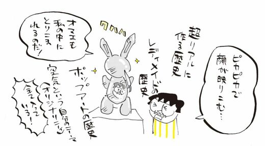 ①よりリアルで精巧なものを作ろうとした歴史、②マルセル・デュシャンが男性用小便器という低俗な既製品を美術として見せ始めた歴史、③アンディ・ウォーホルが大衆文化を美術に取り込んだ歴史、④ジェフ・クーンズ独自の「空気」のテーマ、というように。