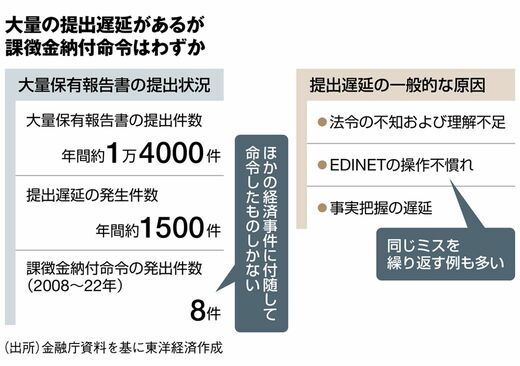 そもそも、現在の大量保有報告制度の下では、制度の複雑さなども相まって提出遅延が相次いでおり、それに対する罰則も機能していないのが現状だ。