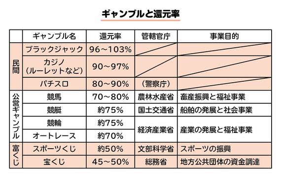 と、その前に、そもそも日本ではギャンブルが禁止のはずです。では、なぜできるのでしょうか? 日本には公営ギャンブルや富くじという、事業主体が省庁や地方公共団体で、控除された額を公益として利用することを目的にしたギャンブル・エンターテインメントがあります。省庁などが監督し、収益金を表のとおり公の事業目的のために利用するため、例外的に認められているのです。