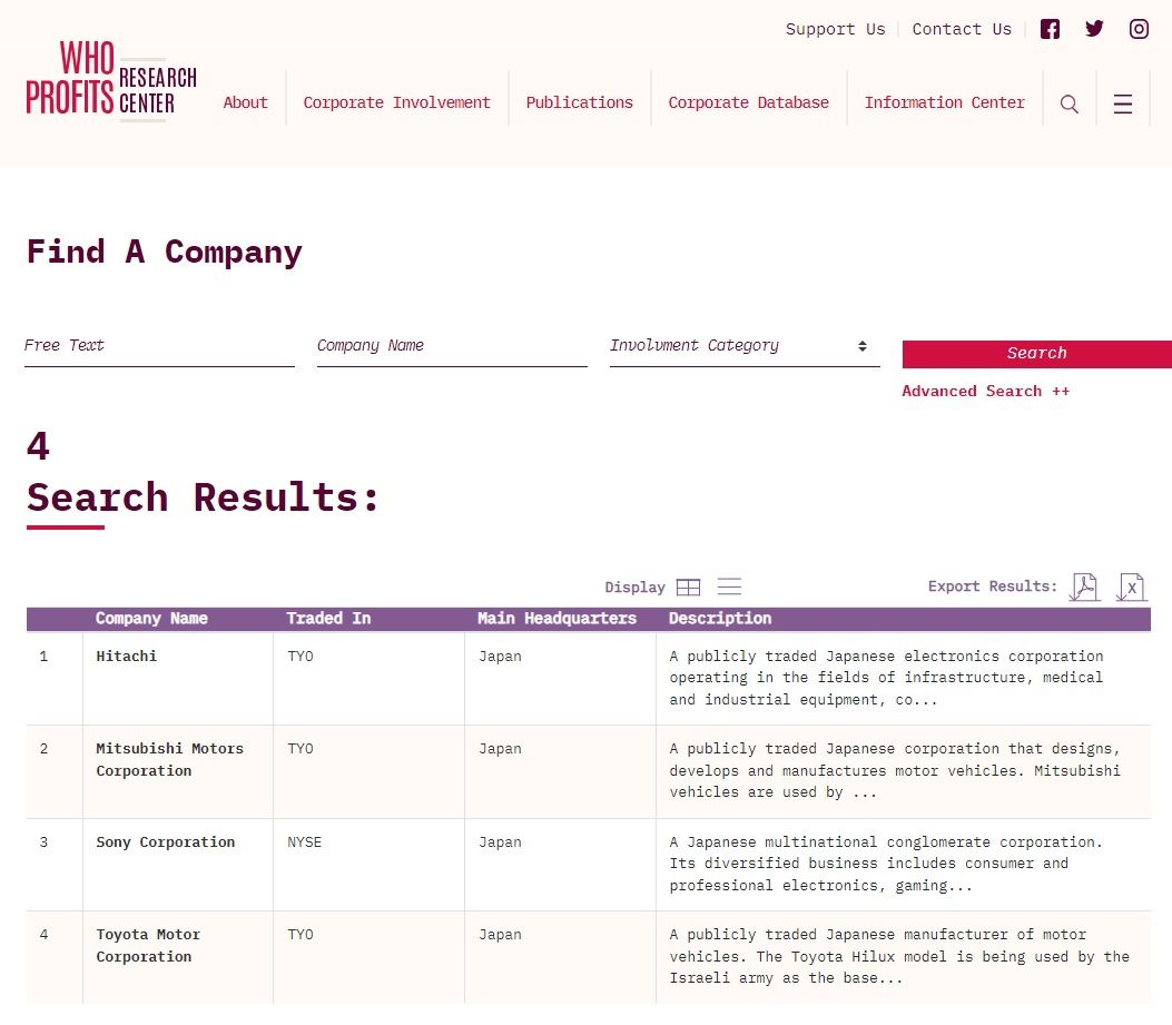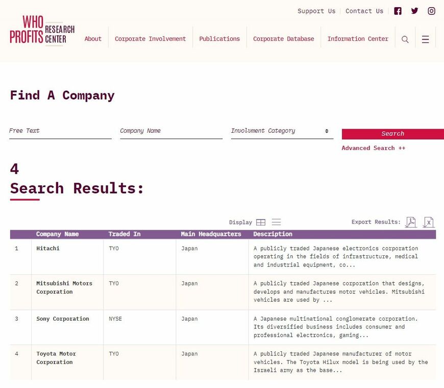 「イスラエルの軍事的抑圧、入植地の拡大、資源と労働力の搾取を助長し、利益を得ている可能性がある企業」を「Who Profits Research Center」はデータベース化している。日本企業を検索すると4社が示された(画像:Who Profits Research Centerのホームページより)