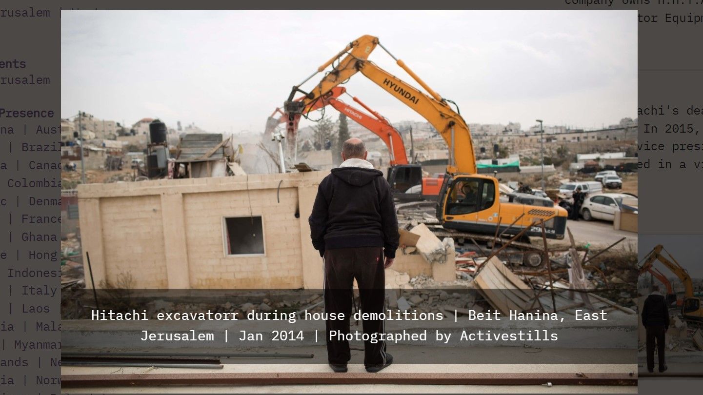 日立建機は、入植地での建設工事や東エルサレムでの家屋解体に同社製品が使われたことを理由にデータベースに含まれている。証拠として、Who Profits Research Centerは、2014年の東エルサレムでの家屋取り壊し現場で撮影されたとする写真をウェブ上に掲載している。