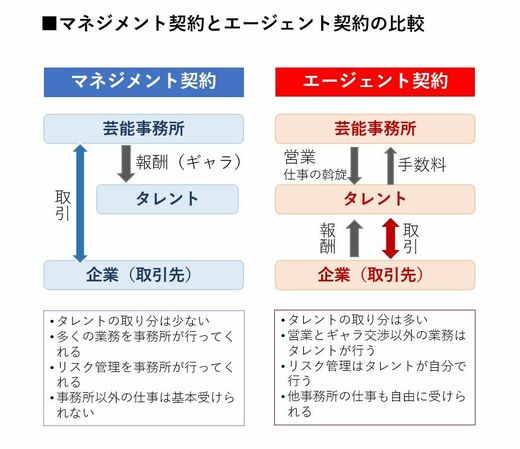 逆に言えば、芸能事務所にとっては、既存のマネジメント契約の方が儲かるし、安定してタレントを囲い込むことができる、「おいしい契約形態」とも見ることができる。