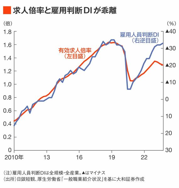 企業のアンケート調査である雇用人員判断DIと有効求人倍率の乖離は大きくなっている。