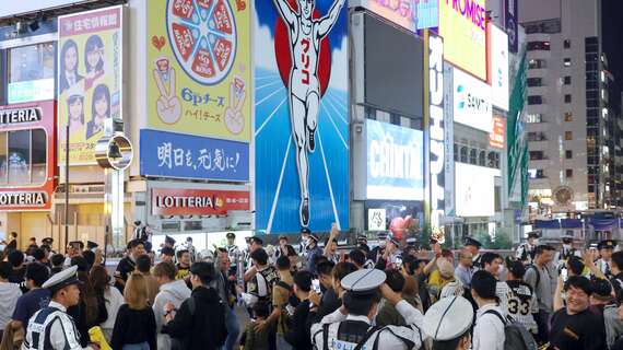 試合が終わって1時間、道頓堀には群衆が押し寄せ、警察の指揮車からは警察官が「立ち止まらないでください、広がらないでください」と声を上げている。
