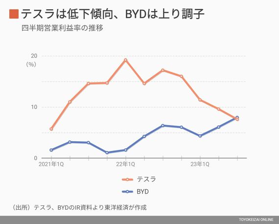 車載バッテリーやモーターといった主力部品を内製しておりコスト競争力も高い。BYDの2023年7~9月の営業利益率は8%とテスラを上回った。