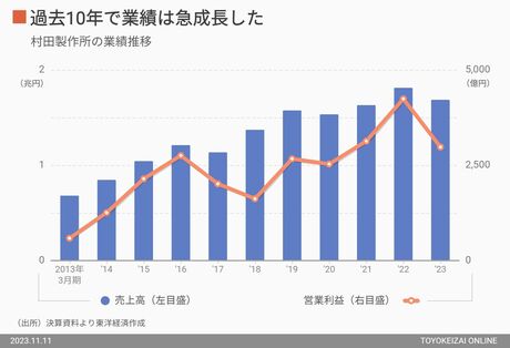 2012年度から2022年度にかけて、村田製作所の売上高は6810億円から1兆6867億円に、営業利益は586億円から2978億円へと急成長した。追い風となったのが、スマホ市場の拡大だ。直近の約1年間は中国のスマホメーカーの在庫調整が長引き苦しんだが、村田会長の言葉どおり底は脱している。