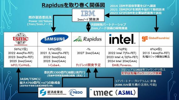 ここで登場する会社はIBMとAMDの製造部門がファウンドリーとして独立したグローバルファウンドリーズ(GF)、韓国のサムスン電子の3社である。この3社を含めた関連する企業・団体等の関係図を図1に示し、ラピダスにつながる時系列を下記に示す。