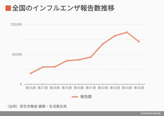 今シーズンの第45週(11月6日~12日)のインフルエンザ報告数は8万5766となった(11月17日に厚生労働省が発表)。2019/2020シーズンの同週5084と比較して約17倍に膨らんでいる。