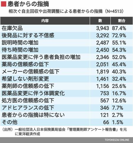 詳しくは後述しますが、薬不足は薬局での待ち時間にも影響を及ぼします。日本保険薬局協会が実施した「管理薬剤師アンケート」によると、患者から「待ち時間の増加」の指摘があったと回答した薬局は54.3%と、半数以上にのぼったと報告されています。