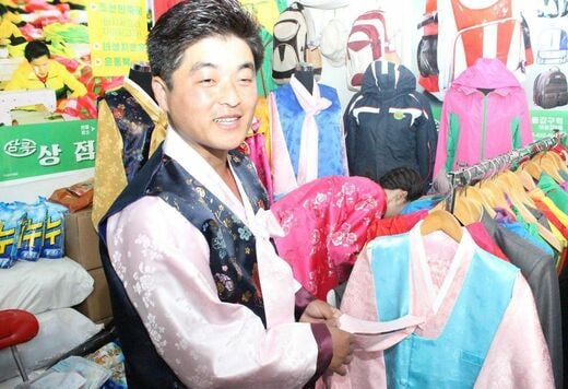 また、鮮やかな伝統衣装を手に取り、「朝鮮民族が自慢する絹織物でつくった衣装」とアピールするのは、松島貿易会社のユン・グムチョル氏(31)だ。同氏は「私のような結婚適齢期の男性に特にぴったりだ」と笑う。