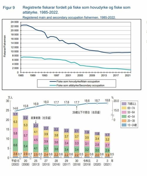 「魚が減ったのは漁業者が減ったから」と言われることもありますが本当でしょうか。これが本当ではないことは、海外と比較するとよくわかります。水産物の輸出金額で世界第2位を誇り、2020年に施行された漁業法改正の際に参考にされたノルウェーと比較してみましょう。水産業を成長産業にできているノルウェーでも、日本同様に漁業者は減り続けています。