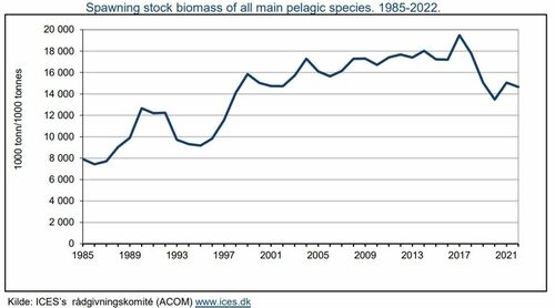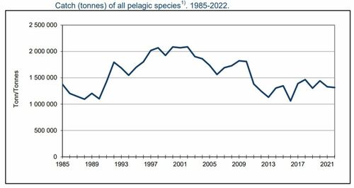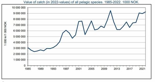 次のグラフは、ノルウェーにおける上がサバなどの浮魚類の漁獲量で、真ん中が同資源量、下が同水揚げ金額の推移です。1970年〜1980年代前後の話ですが、ノルウェーでは、ニシンやマダラなどで乱獲により資源を大きく減少させてしまった苦い経験があります。その後、資源管理を強化した結果、水産業は著しく成長して現在に至ります。