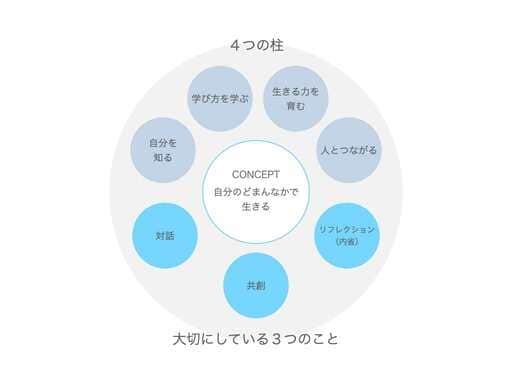 大切にしているのは、次の4つの柱。いちばん大きな柱として「生きる力を育む」、それを支える3つの柱として「自分を知る」「人とつながる」「学び方を学ぶ」があります。