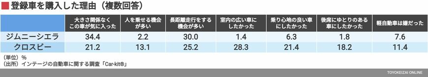 クロスビーでは、「長距離走行をする機会が多い」「室内の広い車にしたかった」のスコアが高く出ており、ハスラーやジムニーシエラとは明確に異なる選ばれ方をしていることがわかる。