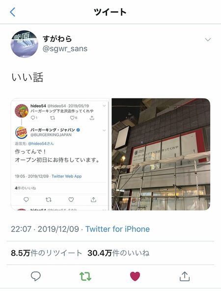 ある日、「バーガーキング下北沢店作ってくれや」というファンからのツイートがあった。約半年後、実際に下北沢駅南口店(東京都世田谷区)のオープンが決定し、公式ツイッター(現X)で「作ってんで! オープン初日にお待ちしております。」とリプライした(ツイートした本人には引用許可を得た)。2019年11月、このやりとりを準備中の店舗に大きく掲げたのだ。