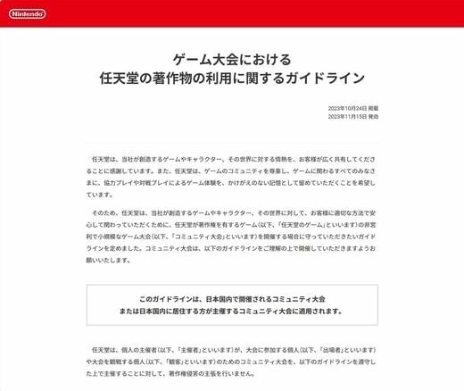 任天堂は10月24日に、公式サイトにて「ゲーム大会における任天堂の著作物の利用に関するガイドライン」を公開しました。これまで任天堂は基本的にeスポーツに関与することなく、ゲーム大会についてはグレーゾーンでしたが、今回のガイドライン公開により、個人やファンの集まりであるコミュニティーはゲーム大会を開催しやすくなったと言えそうです。