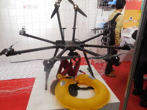 このほかセコムが開発した警備システム(センサーが侵入者をキャッチするとドローンが発進し、搭載したカメラで状況を把握するもの)や、TEAD事業部が出展した、水難事故の要救助者に、上空から救命具を投下する機体なども、新たな活用法として大きな注目を集めた。