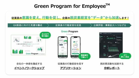 Green Program for EmployeeTMは自身のCO2排出量や削減量を可視化することで環境に対する意識を高め、知識を習得してアクションを促す一連の流れをサポートするプログラムだ。プログラム内で提供されるアプリケーションの利用状況や従業員の意識、行動から環境施策の効果について定量的に把握できるので、社内外への発信や新たな社員向け施策の検討にも活用できる。