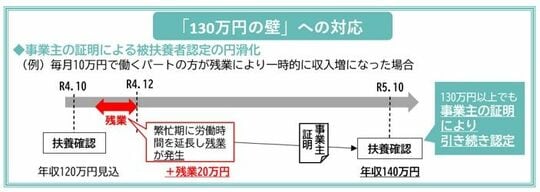 今回の対策では、パート・アルバイト先の人手不足による一時的な増収であれば、年収が130万円を超えてもすぐに扶養が取り消されないこととされました。繁忙期に臨時的に残業をした場合や、ほかの従業員の退職や休職、突発的な大口案件による業務量の増加で収入が増えた場合には、一時的な事情として連続2年までは扶養内にとどまれるようになりました。