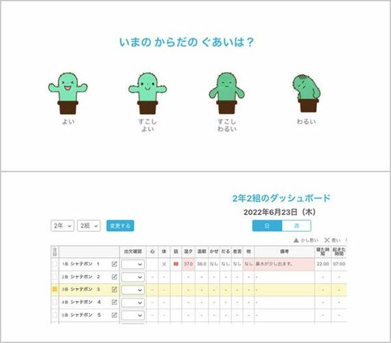 同社は、2021年から健康観察アプリ「シャボテンログ」も展開している。児童生徒が心身の調子を毎日記録することで、自身の状態を“見える化”するアプリだ。児童生徒は自身の過去1カ月のデータを確認することができるほか、画面上から養護教諭への相談をリクエストしたり、STANDBYアプリにつながったりすることもできる。