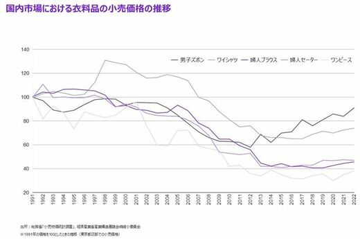 1991年を100とした際の主要な衣料品の価格推移を見てみると、驚くことに、主要な衣料品は約30年前から価格が下がり続けていることがわかります。