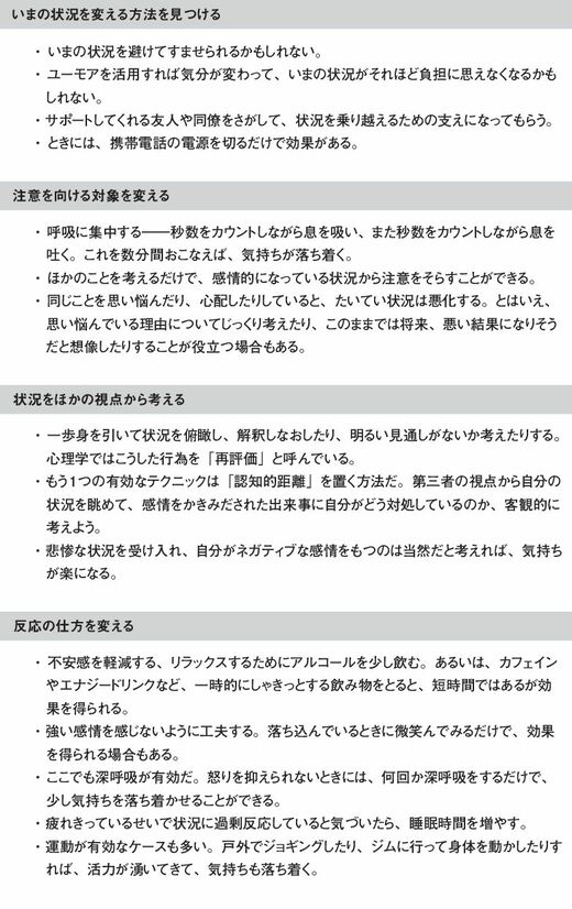 そして最後に、「反応の仕方を変える」ことも試してみよう。あなたの感情の反応に直接影響を及ぼす方法もいくつかある。次の表では、ストレスの多い状況に対処し、強い感情を制御する際によく利用されている方法を紹介する。