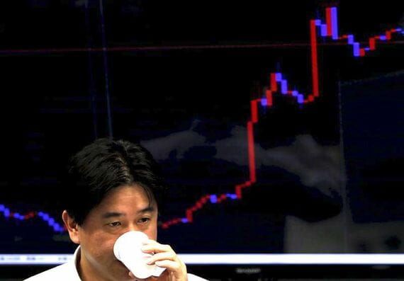 6月2日、正午のドル/円は、前日ニューヨーク市場午後5時時点とほぼ変わらずの124.77/79円だ。午前11時過ぎに12年半ぶりとなる高値125円に乗せたが、すぐに失速した。都内の外為取引会社で3月撮影(2015年 ロイター/YUYA SHINO)