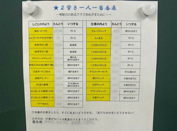 そこで、まずは「1人1当番」で児童たちに仕事を担当してもらうことにした。4月の段階でその方針を伝えると、児童たちは自然と前向きに取り組むようになったという。これにより、柴田氏は雑巾整理など教室の細かな雑務や宿題のチェックなどを手放すことができ、うまく時間を使えるようになった。
