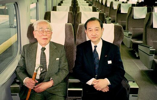 [5、「新幹線生みの親」] のぞみに試乗する島秀雄・元国鉄技師長(左)。隣は須田寬・JR東海社長(当時)