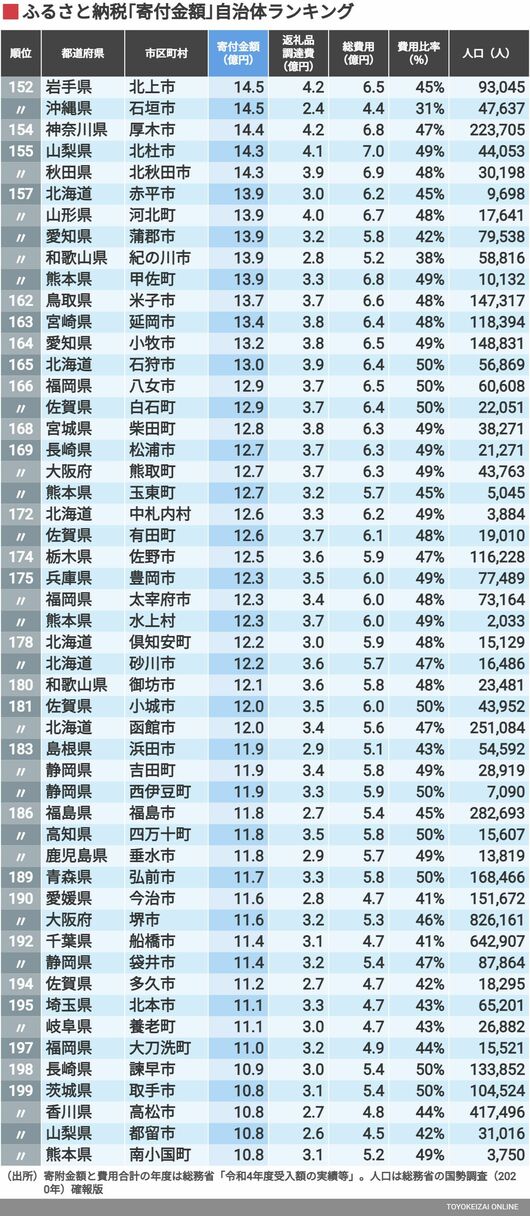 政治・経済・投資 ふるさと納税「寄附金額」自治体ランキング200 牛肉が人気、首位は195億円を集めた宮崎県の市 2分で読める 公開日時:2023/12/08 05:00 東洋経済オンライン編集部 フォロー 1/5 PAGES 2/5 PAGES 3/5 PAGES 4/5 PAGES 5/5 PAGES 最後に152~199位