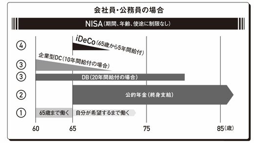 これらを整理すると、何もしなくても確実に入ってくるのが②の公的年金です。①の「働くか、働かないか」はその人の自由、そして③は会社に制度があるかどうかなので自分では決められません。そうなると、①の働くという選択肢を除くと、自分で自由に決められるのは④のiDeCo、そしてNISAということになりますね。