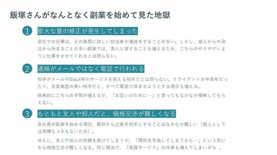 飯塚:自分がやってみて、本業の会社でやる仕事と、副業の個人でやる仕事には、別のやりがいと大変さがあるなと思います。どちらも勉強になりますし、副業をやっているからといって、本業は疎かにならないのでは? というのがやってみた感想です。そもそも副業までチャレンジする人って、本業もちゃんと仕事しているような真面目な人が多そうですよねえ。
