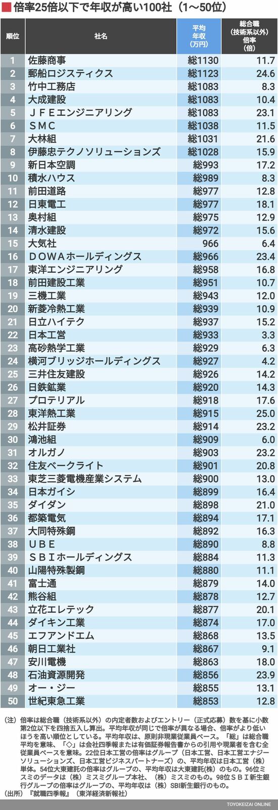 キャリア・教育 #就職四季報プラスワン 前の記事 次の記事 「就活の内定倍率」25倍以下で年収高いTOP100社 年収1000万円超も多数!「穴場企業」はどこか 3分で読める 公開日時:2023/12/07 05:00 丹羽 夏海 東洋経済『就職四季報』編集部 フォロー 1/3 PAGES 2/3 PAGES 1~50位 次ページが続きます 3/3 PAGES
