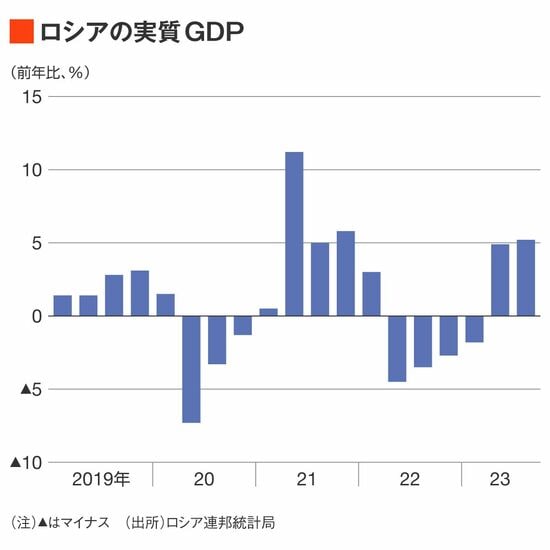 ロシアの2023年7〜9月期の実質GDP(国内総生産)は速報ベースで前年比年率5.2%増と、前期(同4.9%増)から伸びが加速した。10〜12月期も堅調が続くもようで、ロシア中央銀行は11月7日に公表した『金融政策レポート』で、2023年の実質GDP成長率は2.2〜2.7%増のレンジとなり、前年のマイナス(2.1%減)を取り戻すと予測している。